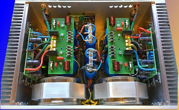 Endverstärker Class A-B 2 x 140 Watt Sinus an 8 Ohm,. 2 x 350 VA Doppelmonoaufbau. 130.000 μF Kapazität. Doppelwellen-